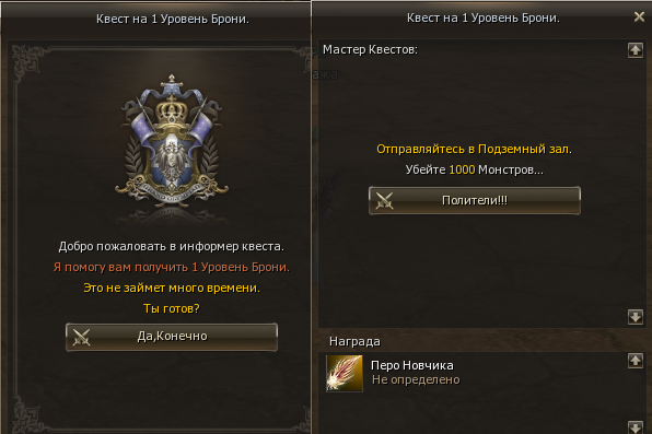 | Мастер Квестов (Квест на 1 Уровень) | Пройдя не долгий квест, вы сможете получить 1 уровень Брони. |